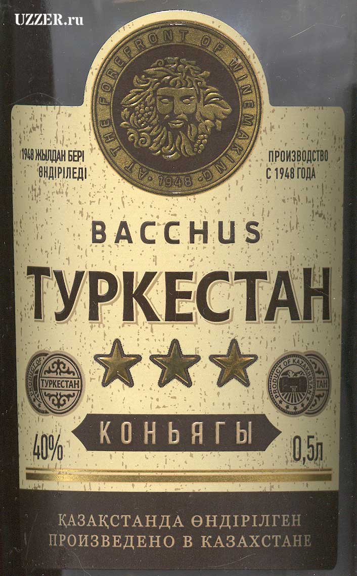 Главная этикетка, оформлена в стиле... Изображение на медали - видимо сам Бахус... далее - производство с 1948 года. Имя производителя - Bacchus, название - Туркестан, коньягы... две медали, 40% и 0,5 л. Произведено в Казахстане.
