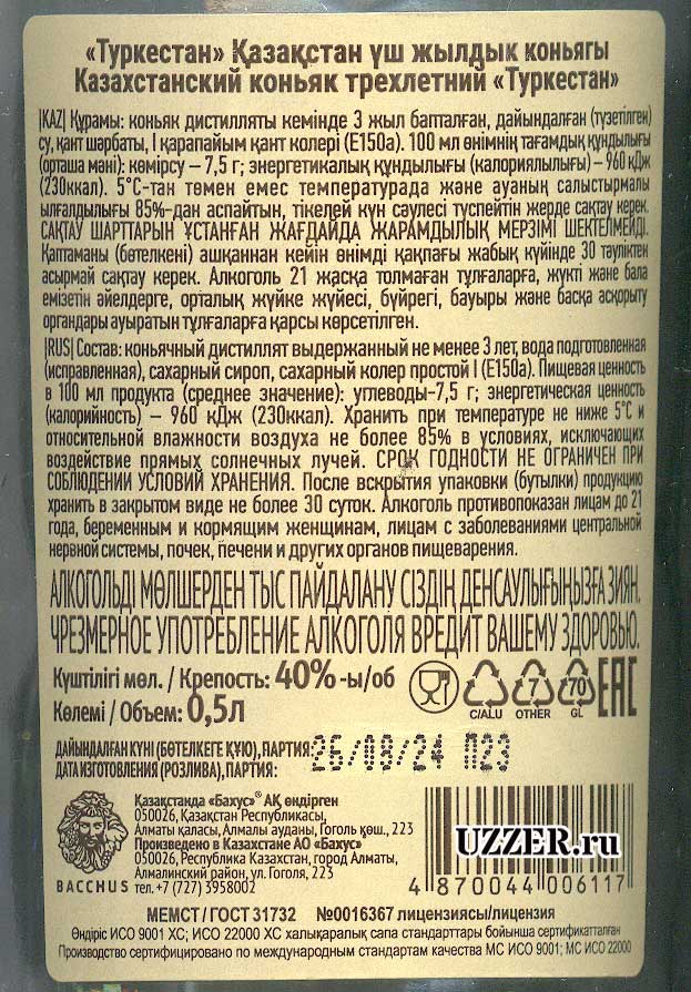 Label on the back of the bottle. Here is the information in Kazakh and Russian: Three-year-old Kazakh cognac "Turkestan". The following is the composition: cognac distillate aged for at least 3 years, prepared (corrected) water, sugar syrup, simple caramel color I (E150a). Any other information - if you are interested, look at the photo yourself. Manufacturer: JSC "Bacchus", Kazakhstan, Almaty, Gogol str., 223.