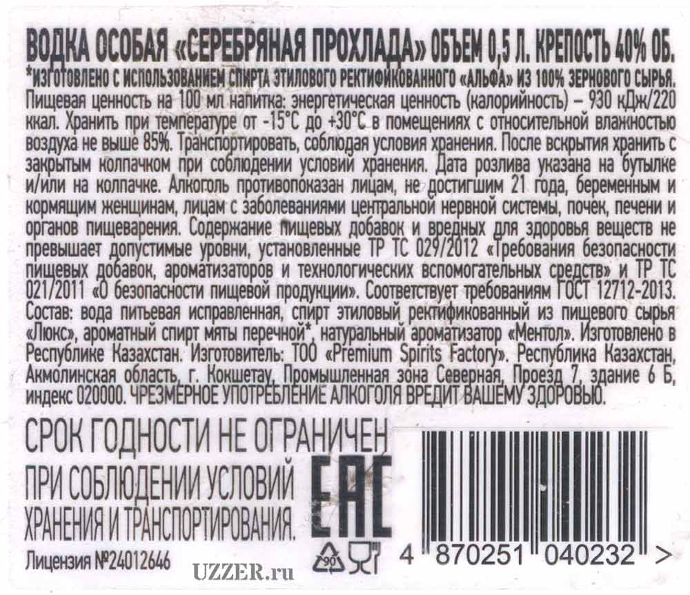 А где вторая этикетка? Ищем и находим... и понимаем - начинаются маркетинговые чудеса. Для начала - этикетка напечатана на прозрачной пленке мелким шрифтом и она практически не читаемая! Я в очках не мог прочесть! Беру увеличительное стекло и читаю: Водка особая "Серебряная прохлада", объем 0,5 л крепость 40% ОБ. Дальше нужна оптика помощнее... *изготовлено с использованием этилового спирта ректификованного "Альфа" из 100% зернового сырья. Что за странности? Состав: вода питьевая исправленная, спирт этиловый ректификованный из пищевого сырья "Люкс", ароматный спирт мяты перечной*, натуральный ароматизатор "Ментол"... Производитель: ТОО "Premium Spirits factory", Казахстан, Кокшетау...