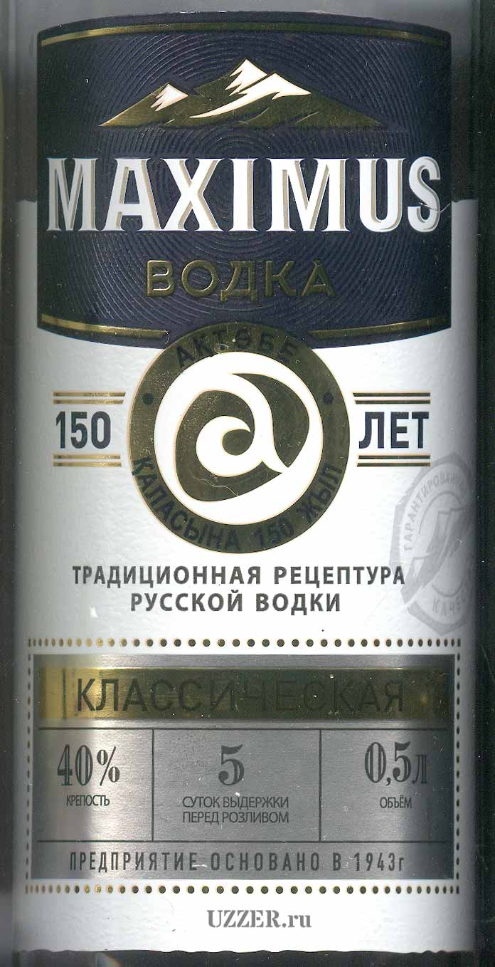 Основная или главная этикетка, на ней изображены стилизованные горы, название: MAXIMUS Водка. 150 лет городу Актобе. Традиционная рецептура русской водки. Классическая. 40% крепость. 0,5 Л объем. 5 суток выдержки перед розливом. Предприятие основано в 1943 году.