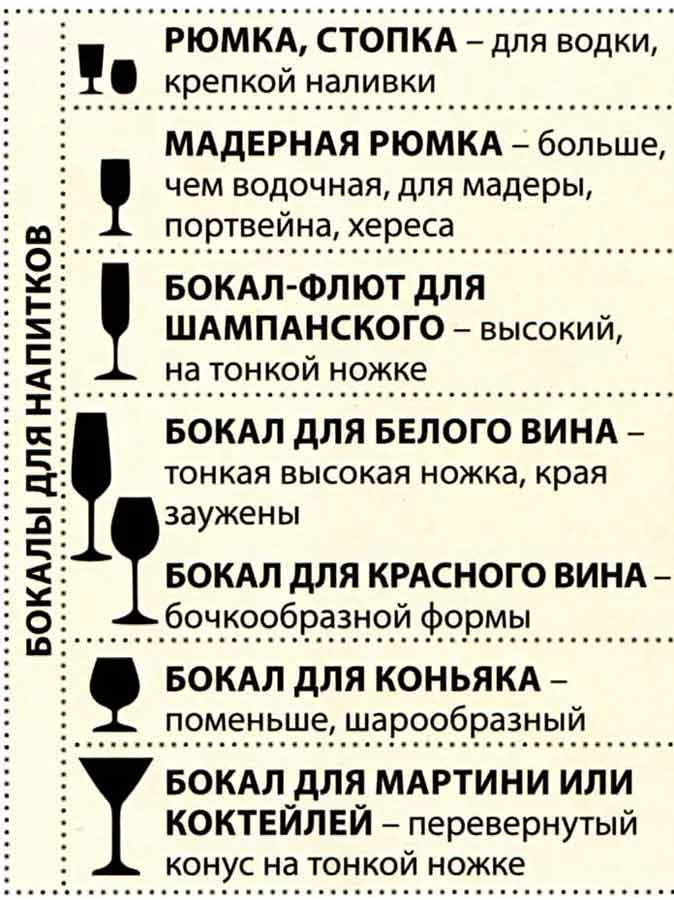 Если напитков больше трех, бокалы выстроены в два ряда по «росту», а с увеличением крепости напитка уменьшаются объемы. Фужер для воды стоит крайним слева или справа. В соответствии с правилами французской сервировки бокалы расставлены над тарелками, по центру. На английский манер их выстраивают начиная с винного над столовым ножом.