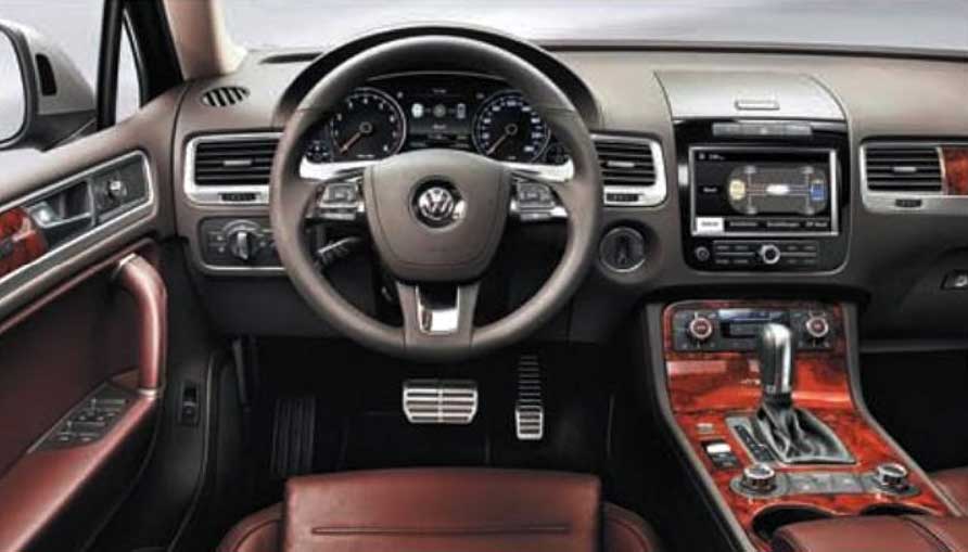 Сходство с последними новинками от Volkswagen прослеживается и в эргономике водительского места. Touareg получил совершенно новые переднюю панель и центральную консоль, руль, оформление приборов. Интерьер автомобиля ничуть не утратил функциональности, но стал выглядеть более «сложносочиненным». На месте экрана размером 6,5 дюйма теперь огромный восьмидюймовый цветной дисплей. Это уже весьма навороченное «кино». С дисплея можно осуществлять руководство и контроль за такими функциями, как система навигации в трехмерном изображении, DVD, MP3 (включая iPod и iPhone). Сюда же можно вывести изображение с четырех видеокамер, расположенных по периметру машины. В базовом оснащении нового Touareg появились адаптивный круиз-контроль и адаптивные биксеноновые фары головного света, а также система Side Assist, которая информирует водителя о помехах, возникающих при перестроениях. Немаловажно, что меню управления системами Touareg полностью русифицировано.