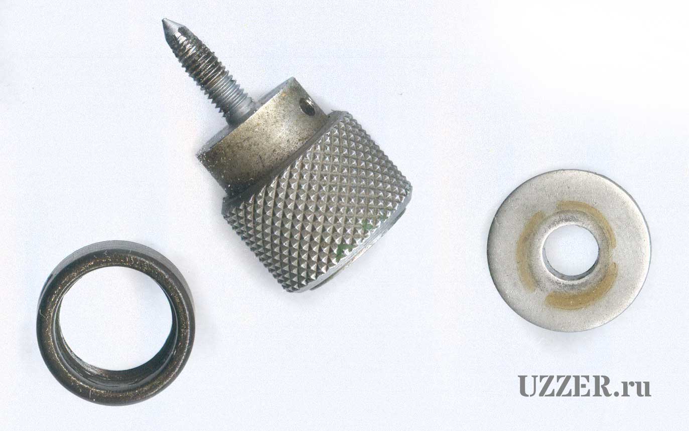 Микровинт и барабан. На торце микровинта конус, на торце барабана под него притертое конусное посадочное место. Фиксирует микровинт в барабане трещотка через шайбу.