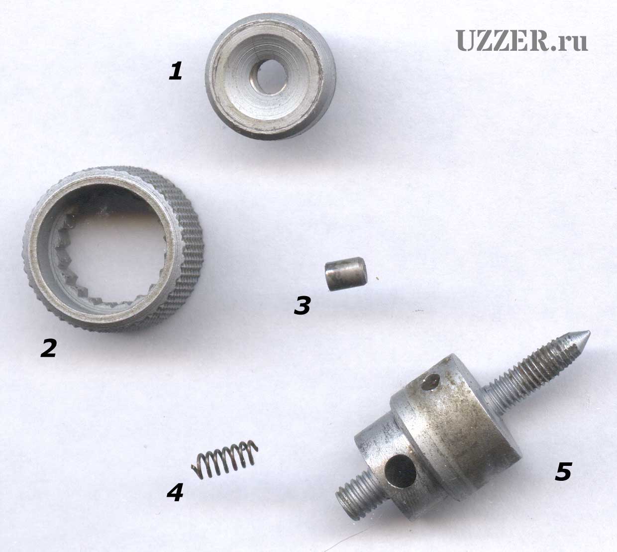 Трещотка состоит из кольца с внутренними зубьями (2), штифт (3), который имеет с одной стороны поверхность с радиусом. Именно этим радиусом штифт трется о зубья. Снизу его поджимает пружина (4). В корпусе трещотки (5) есть отверстие под углом - сперва вставляется в него пружина, поверх штифт, радиусом наружу. Затем он прижимается пальцем и одевается кольцо с внутренними зубцами. Сверху накручивается гайка.