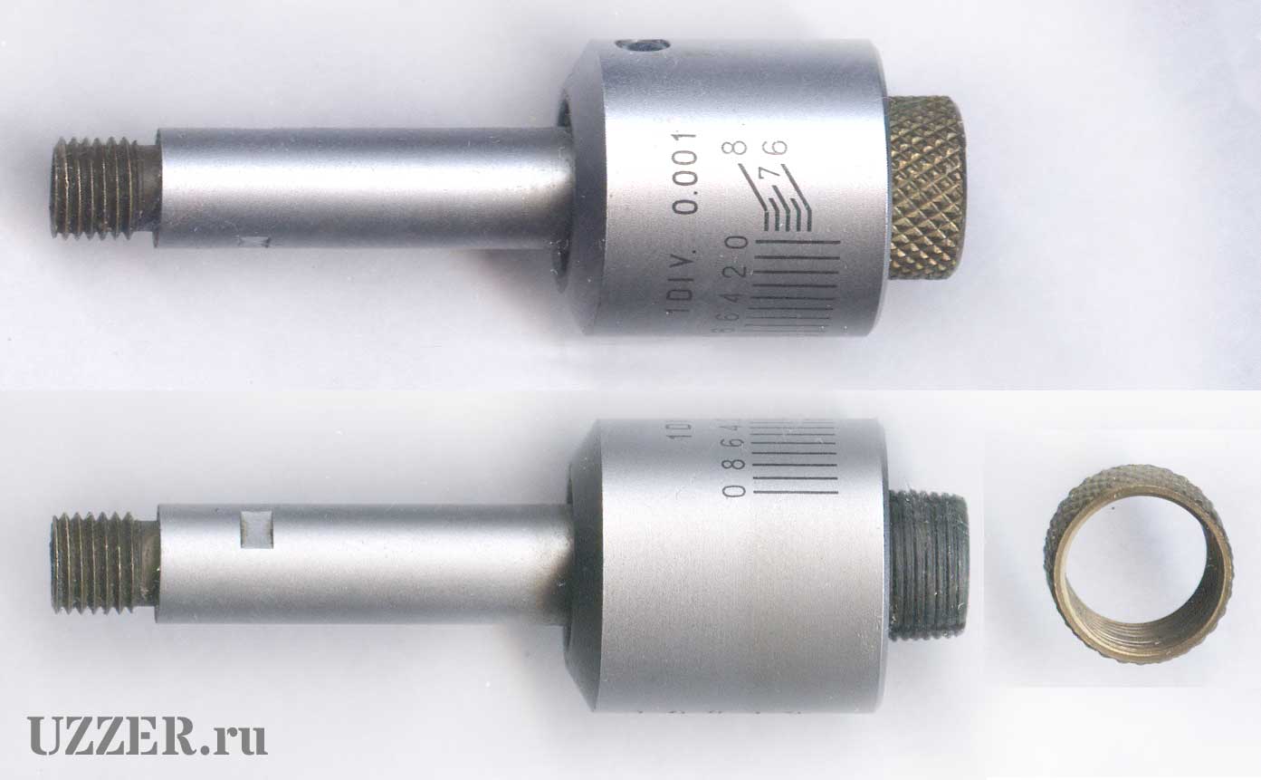 В нижней части на штанге видим резьба, для присоединения самой измерительной головки (или её установки через удлинитель). Так же там есть профрезерованные шлицы - под ключ. Наконечник микровинта имеет впрессованный стальной шарик.