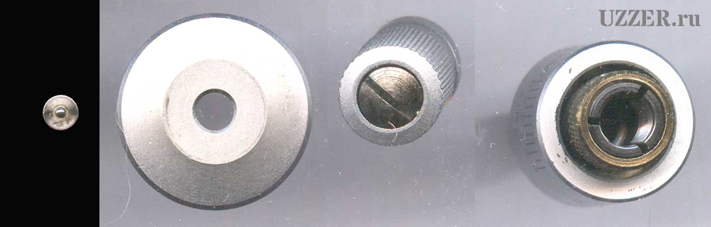 Сверху трещотка притянута винтом со шлицем под плоскую отвертку. Вот ряд фото, слева направо: впрессованный в пятку микровинта шарик, верхняя часть барабана, трещотка вид сверху, внутренняя резьба на стебле с регулировочной гайкой.