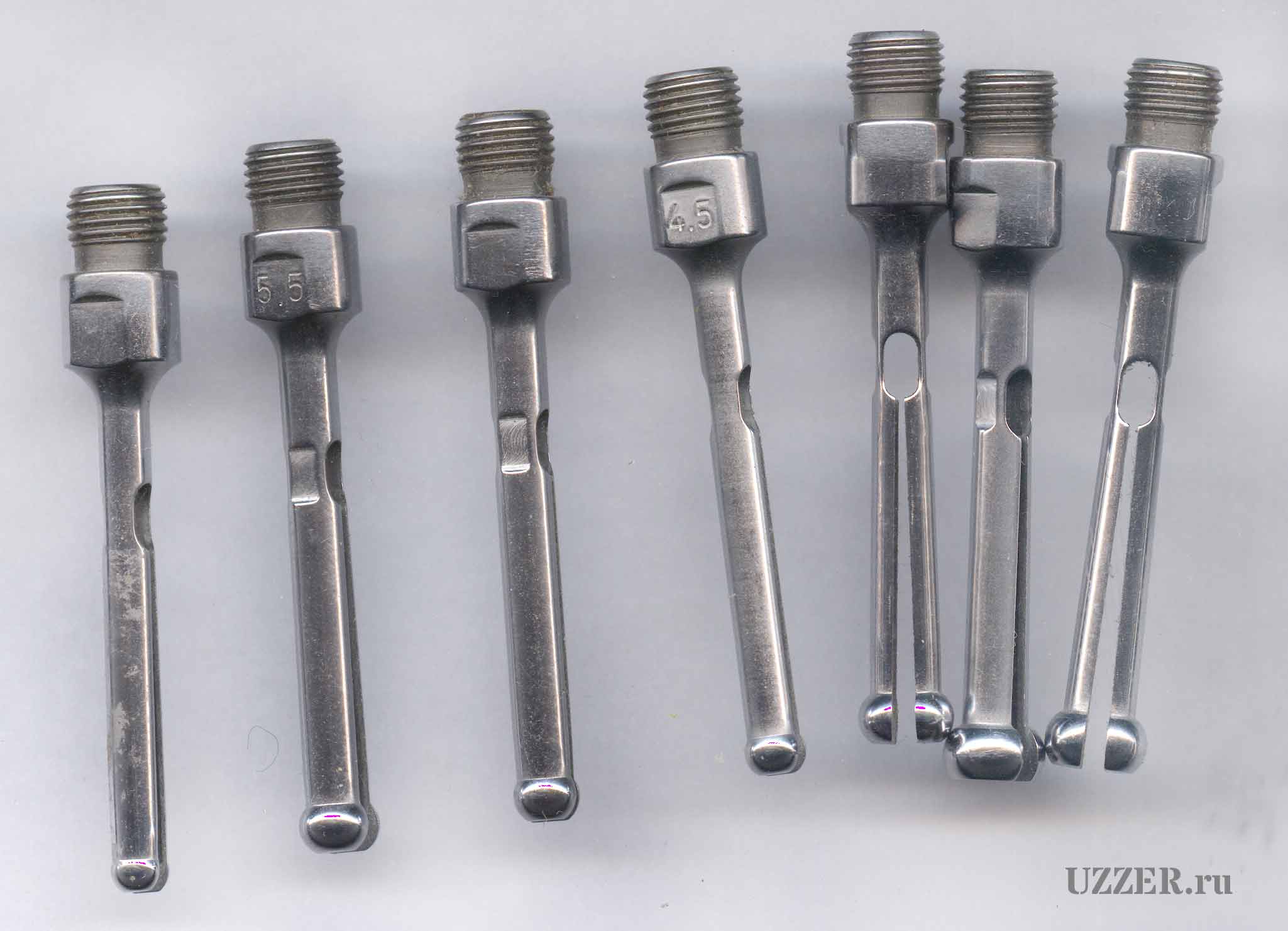 По каталогу производителя они имеют номера от 201428 до 201434. На них ближе к резьбе выгравированы номера: 4 (3,7-4,3 мм); 4,5 (4,2-4,8 мм); 5 (4,7-5,3 мм); 5,5 (5,2-5,8 мм); 6 (5,7-6,3 мм); 6,5 (6,2-6,8 мм); 7 (6,7-7,3 мм) - в скобках указан диапазон измерений наконечника. Резьба присоединения наконечника к штанге нутромера М7.