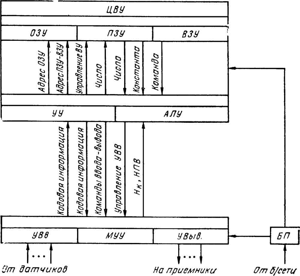 БЦВМ (рис. 1) делится на три функциональные части: цифровое вычислительное устройство ЦВУ, устройство ввода-вывода УBв и блок питания БП. В свою очередь, ЦВУ включает в себя устройство арифметики и управления УАУ — процессор, состоящий из устройства управления УУ и арифметико-логического устройства АЛУ, и запоминающие устройства ЗУ — оперативное ОЗУ, постоянное ПЗУ и внешнее ВЗУ.