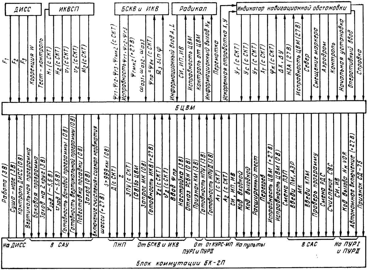Связь БЦВМ с подсистемами навигационного комплекса приведена на рис. 2, где на линиях связи обозначены команды и сигналы, которыми они обмениваются во время предполетной подготовки и полета.