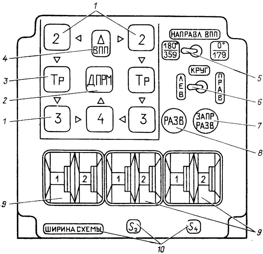 1 — кнопка-табло сигнализации подхода ЛА к точкам схемы предпосадочного маневра; 2 — кнопка-табло сигнализации подхода ЛА к ДПРМ; 3 — табло сигнализации нахождения ЛА в районе траверза ДПРМ; 4 — табло сигнализации выработки признака «Подготовка посадки»; 5 — переключатель для задания направления ВПП; 6 — переключатель задания правого или левого круга при заходе на посадку; 7 — кнопка включения немедленного разворота ЛА на 90°; 8 — кнопка-табло сигнализации и осуществления запрета разворота и обеспечения продолжения полета в заданном направлении; 9 — переключатели для установки параметров схемы предпосадочного маневра; 10 — табло параметров предпосадочного маневра