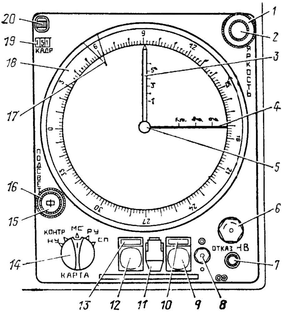 1 — переключатель для замены отказавшей лампы подсвета; 2 — рукоятка регулировки яркости экрана; 3 — указатель путевого угла ПУ; 4 — указатель истинного пеленга ориентира ИПО; 5 — центральный маркер; 6 — рукоятка ручного управления перемещением и разворотом изображения карты и указателя ИПО; 7 — лампа сигнализации отказа навигационного вычислителя; 8 — переключатель для включения индикации маркера; 9 — кнопка-табло для изменения режима управления указателя ИПО; 10 — табло сигнализации режима автоматического управления; (АУ); 11 — защитная крышка кнопки «Ввод»; 12— кнопка-табло изменения масштаба изображения карты; 13—табло сигнализации нахождения ЛА в зоне аэродрома; 14 — переключатель режимов управления; 15 — рукоятка регулировки резкости; 16 — рукоятка регулировки яркости подсвета табло и кнопок; 17 — отсчетный индекс; 18 — шкала курсов; 19 — счетчик кадров микрофильма; 20 — кнопка-табло включения ориентации карты