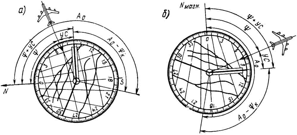 Изображение карты автоматически ориентируется по линии пути (рис. 8). Указатель путевого угла устанавливается вдоль вертикального диаметра экрана ИНО. Изображение карты и шкала курсов разворачиваются так, чтобы значение φ + УС совпадали с указателем путевого угла. Курсовой угол φ определяется углом между нулевой отметкой шкалы и индексом, угол сноса УС — углом между индексом и указателем путевого угла. Для ориентации карты на север необходимо нажимать клавишу-табло ориентации до загорания на ней «С». Изображение карты ориентируется на север, т. е. вдоль вертикального диаметра экрана ИНО. Нулевое деление шкалы также совмещается с ним. Указатель путевого угла устанавливается на угол φ + УС. Положение индекса на шкале определяется значением φ.