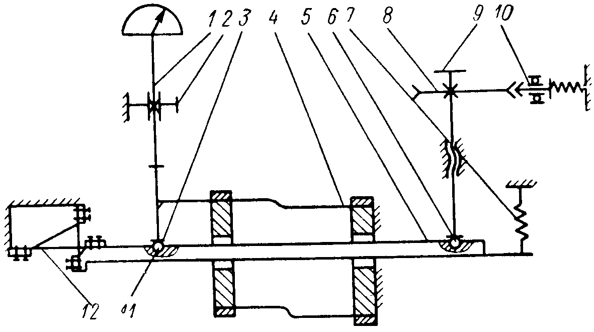 Для высокопроизводительной поверки систематической составляющей погрешности измерительных головок с ценой деления более 1 мкм на ЛИЗе применяется стенд типа ОК-20, схема которого представлена на рис. 3. При повороте микрометрического винта 9, контактирующего с шариком 6, поворачивается рычаг 5, закрепленный на пластинчатом кресте 12 и имеющий соотношение плеч 1:10. При этом перемещается промежуточный наконечник 3, подвешенный на плоских пружинах 4, который воздействует на наконечник измерительной головки 1, установленный в кронштейне 2. Наконечник 3 контактирует с шариком 11, измерительное усилие создается пружиной 7. На микрометрическом винте 9 закреплен лимб 8. На лимбе имеются пазы, куда входит подпружинный фиксатор 10. Пазы нанесены при тарировке стенда по образцовой измерительной головке в заданных точках поверки через номинальный интервал lн. Для поверки головка закрепляется в кронштейне 2. Указатель головки устанавливается на ноль. При этом фиксатор 10 западает в паз лимба 8 с нулевой отметкой. Повернув винт 9 до западания фиксатора в следующий паз лимба, по поверяемой головке 1 снимают отсчет li. Разность Δс = li — lн определяет систематическую составляющую погрешности.