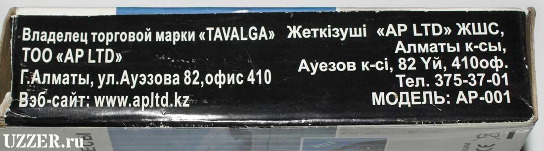На торце коробки на русском и казахском языка написано: Владелец торговой марки "TAVALGA" ТОО "AP LTD" - Алматы, адрес компании... электронный адрес, названный "вэб-сайт"... название модели АР-001... Хорошо еще, что нигде не написано "Made in Kazakstan".