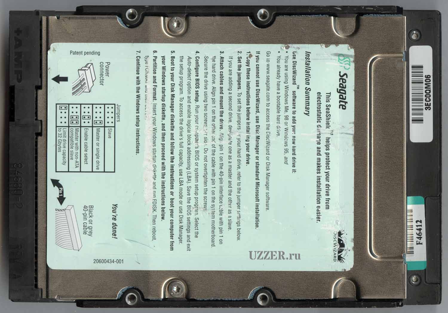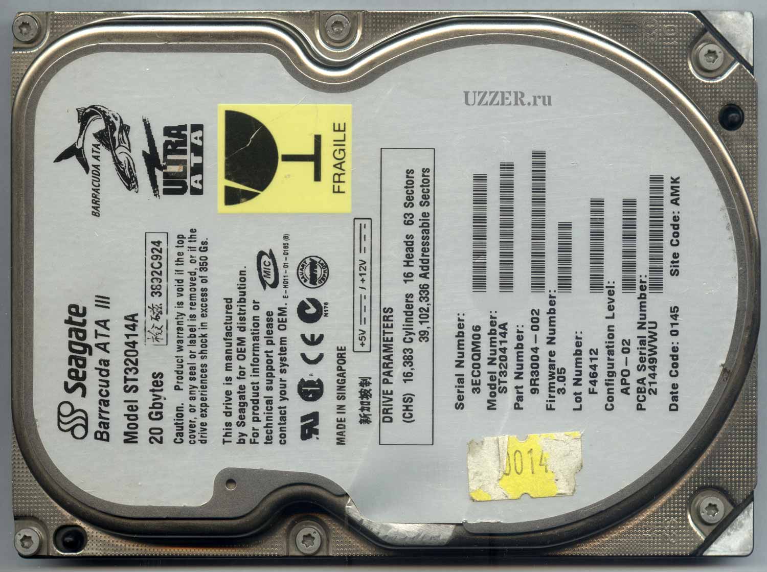 На этикетке мы видим логотип Seagate затем хищная рыбина - Barracuda ATA, даже Ultra ATA. Название модели - ST320414A. Емкость - 20 Гб. Прошивка версии 3.05. Сделано в Сингапуре.