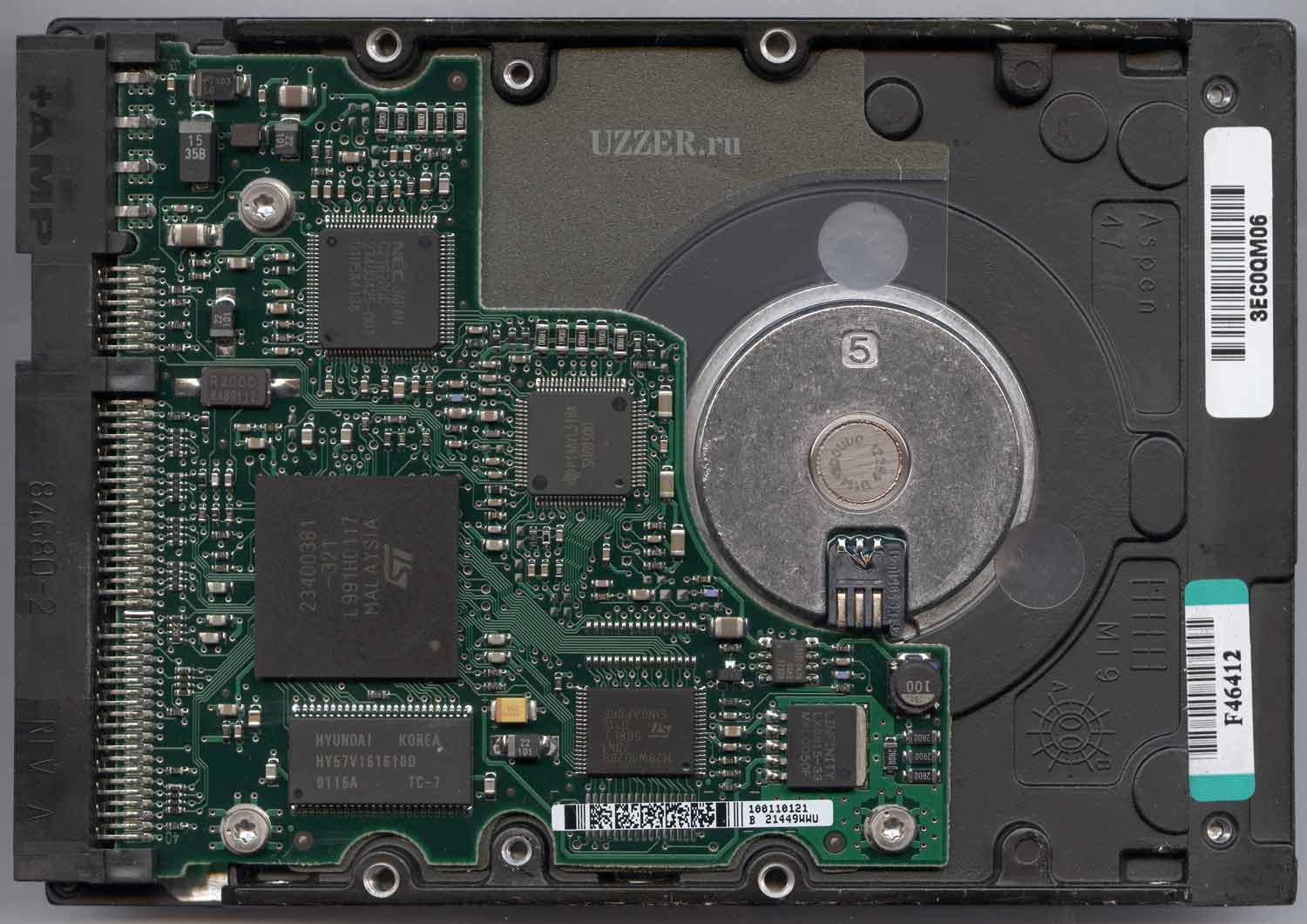 Выкрутив два винта (шляпки с шестиконечными звездочками), убираем эту пластину. Видим торец шпиндельного двигателя и плату контроллера. На плате видим "главную" микросхему - собственно сам микроконтроллер: 23400361-321 L991H0117 и логотип STMicroelectronics. Рядом чип оперативной памяти HYUNDAI HY57V161610D. Микросхема флэш-памяти M29W102BB70N1. Далее чип LINFINITY LX8815-33 и это двухканальный стабилизатор напряжения. Восьминогая микросхема International Rectifier - IR 047H S3A2 F7326 - транзистор МОСФЕТ в паре с диодом Шоттки. Микросхема с логотипом Texas Instruments - P14AYL3TBA SH6950D и это драйвер двигателя. NEC C2162BGC 23400425-001 это регулятор и стабилизатор напряжения.