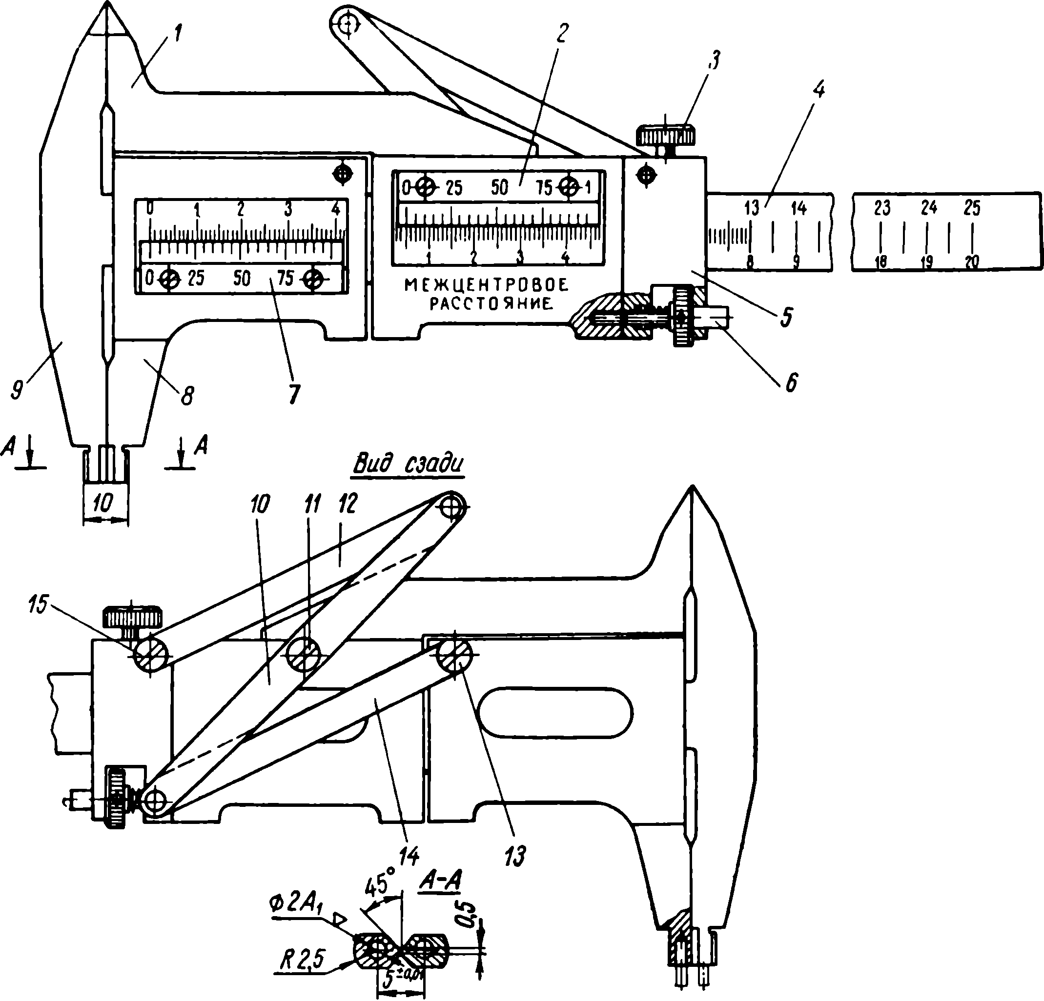 При необходимости измерения больших межцентровых расстояний шарнирный механизм, соединяющий подвижные губки и хомутик, может быть заменен малогабаритным шестеренно-реечным механизмом (на губке 1 на цапфе 11 устанавливается шестеренка, а на цапфах 13 и 15 на губке 8 и хомутике 5 — зубчатые рейки).
