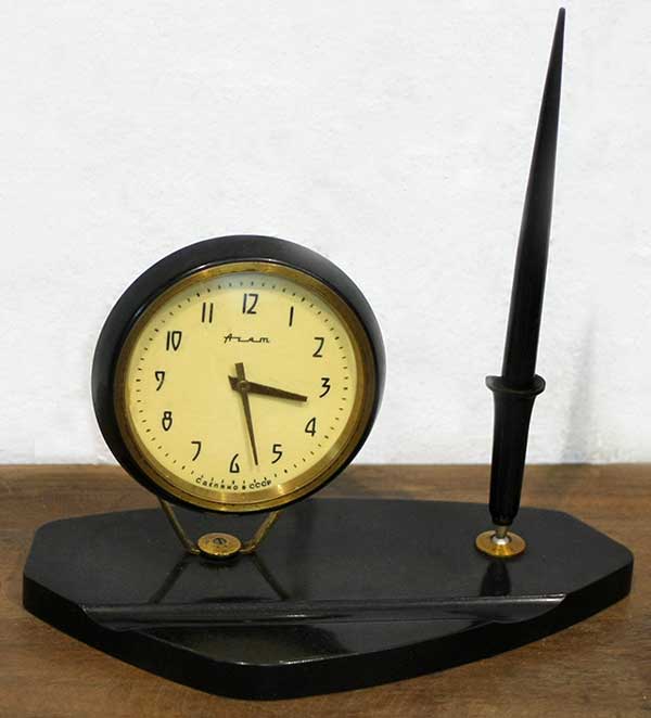 А изначально часы выглядели так (фотографии взяты из интернета): достаточно массивное основание из бакелита. С правой стороны в шаровой опоре гнездо для перьевой ручки, слева сами часы в поворотном кронштейне. Впереди выемка - также для перьевых ручек... Этакие стильные часы для кабинета начальника, или писателя... На пластмассовом основании часто делали подарочные гравировки, заливали их "золотом" и все это смотрелось очень даже хорошо.