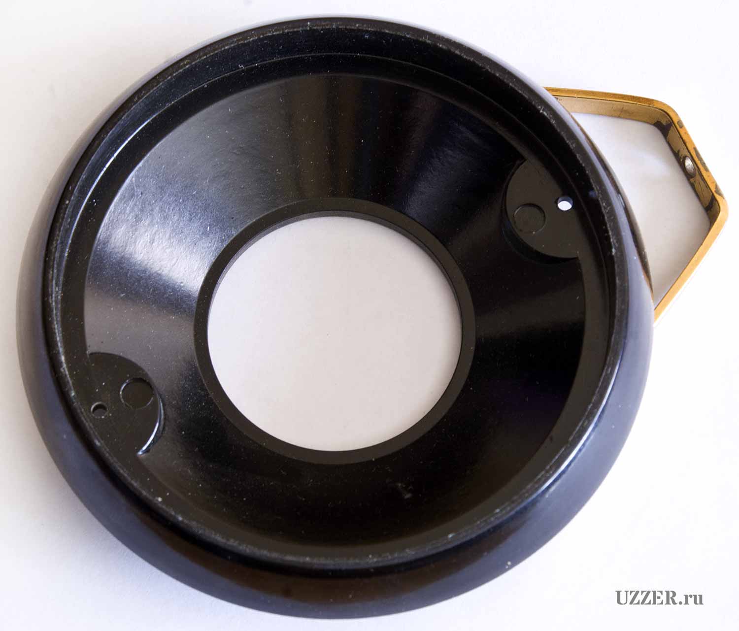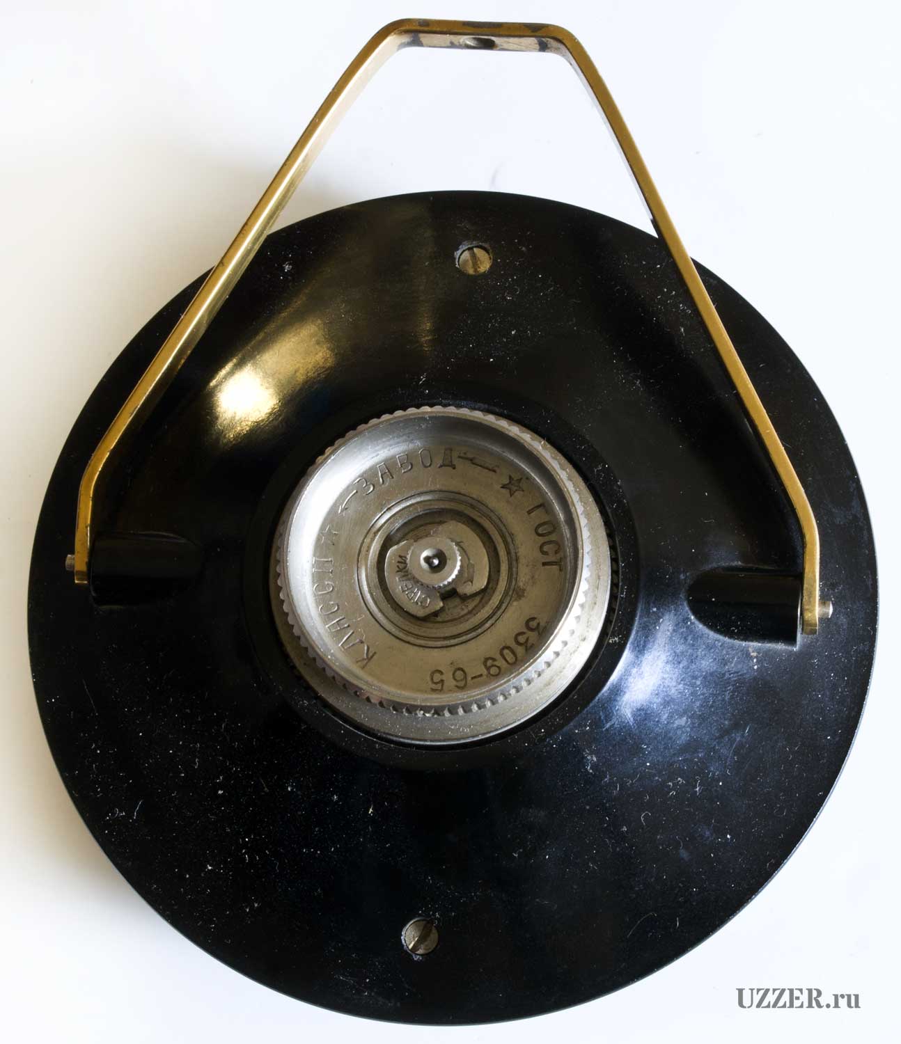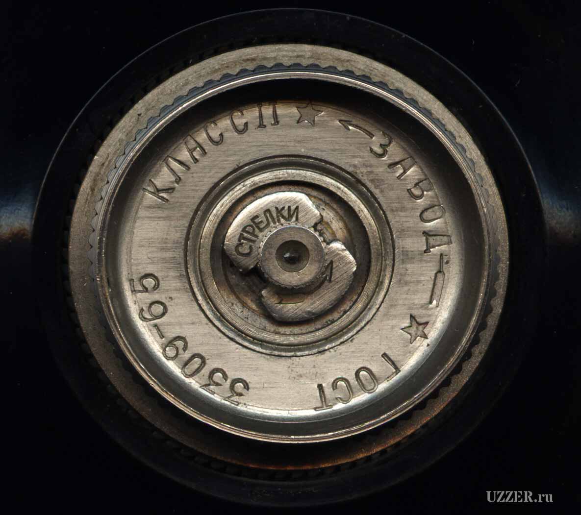 По центру металлическая вставка: зубчатый диск - взвод заводной пружины, а еще более - по центру ручка, рядом выбита стрелка - направление вращения и надпись "Стрелки" - этой ручкой осуществляется перевод стрелок. По кругу выбито: ГОСТ 3309-65 КЛАСС II, две звездочки и между ними надписью - "Завод" снова со стрелкой показывающей направление вращения.