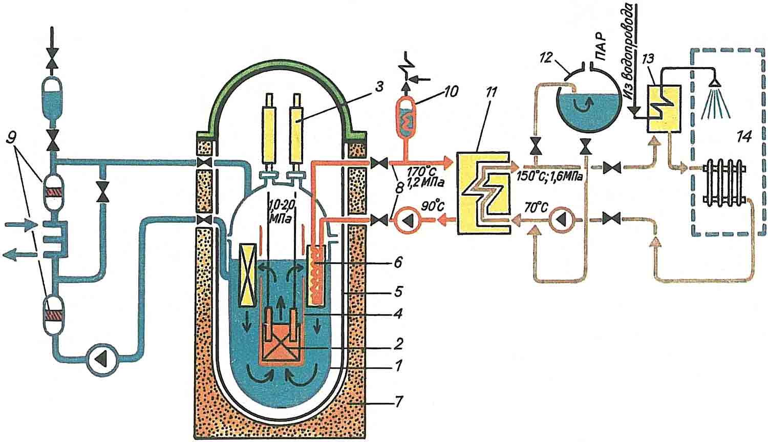 Принципиальная схема ACT: 1—8 — то же, что и на схеме реактора, 9 — вспомогательные системы первого контура (очистка теплоносителя, ввод поглотителя нейтронов), 10 — компенсатор объема теплоносителя второго контура, 11 — сетевой теплообменник, 12 — система аварийного расхолаживания реакторной установки, 13 — тепловой пункт, 14 — потребитель тепла.