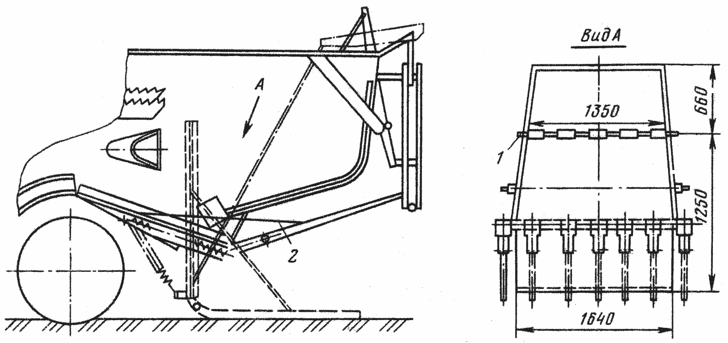 Улучшению схода копны с днища копнителя и сокращению потерь соломы помогает специальное устройство. Оно состоит из миллиметрового листа 2 (см. схему) с приваренными снизу продольными ребрами жесткости. Передним концом лист шарнирно закреплен в боковых продольных ребрах 1 днища, задним опирается на его пальцы. Лист выполнен по конфигурации продольного сечения копнителя. Задний конец листа завернут вниз в виде трубки, что обеспечивает лучшее скольжение конца листа по пальцам днища и предотвращение задиров.