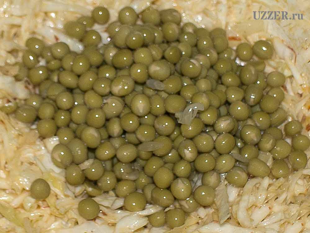 Внутри мы видим вот такой горошек. Делал капустный салат. Что можно сказать? Раньше этот продукт был хорошим, но сейчас... жесткий, вероятно восстановленный из сушеного... Горошины многие не целые, лопнула кожура, иногда слезла вообще. Для салата в принципе годиться... Но все равно - это продукт не высшего сорта!