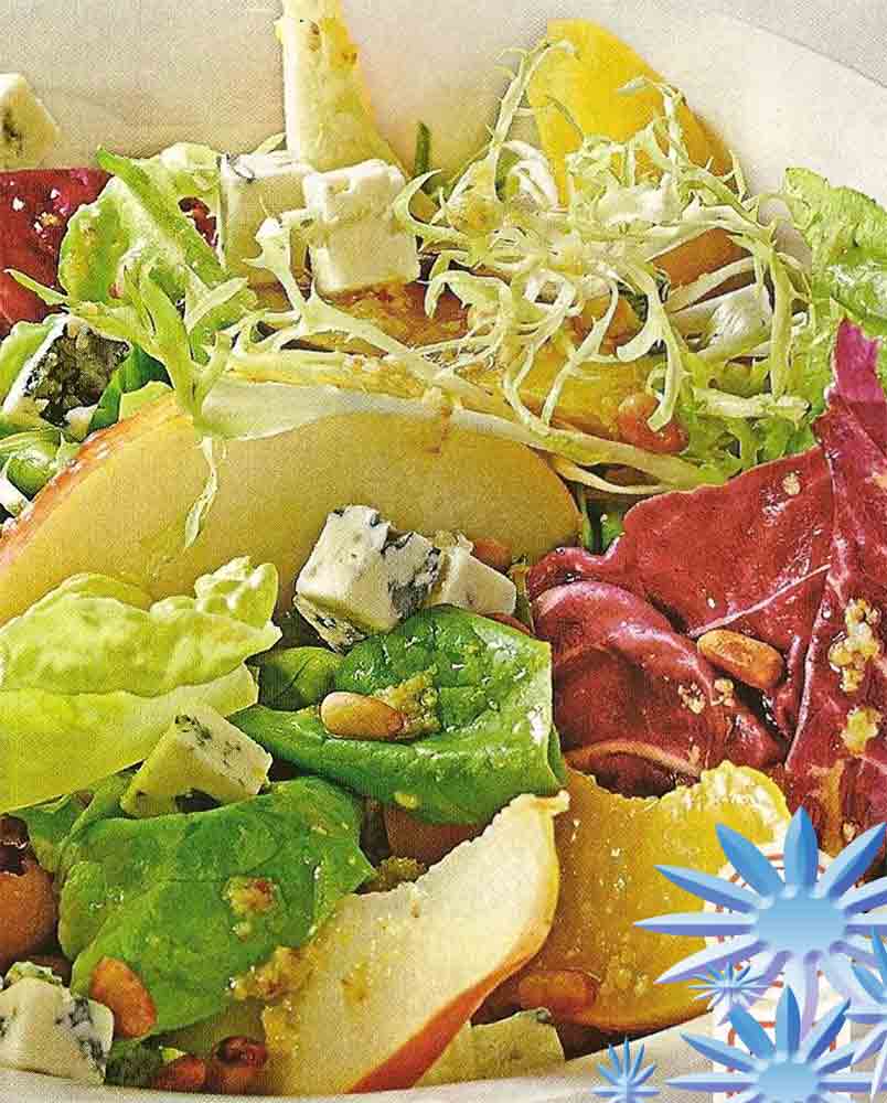 3. Порвите листья салата, перемешайте их с заправкой, украсьте дольками персика и груши, посыпьте кедровыми орешками и кубиками сыра с плесенью.