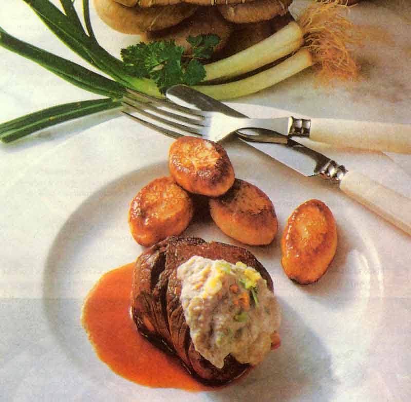 1. Лук очистить и мелко нарезать. Смешать с 2 ст. л. топленого масла, белым вином, пряными травами, солью и перцем. Добавить очищенный и измельченный чеснок.