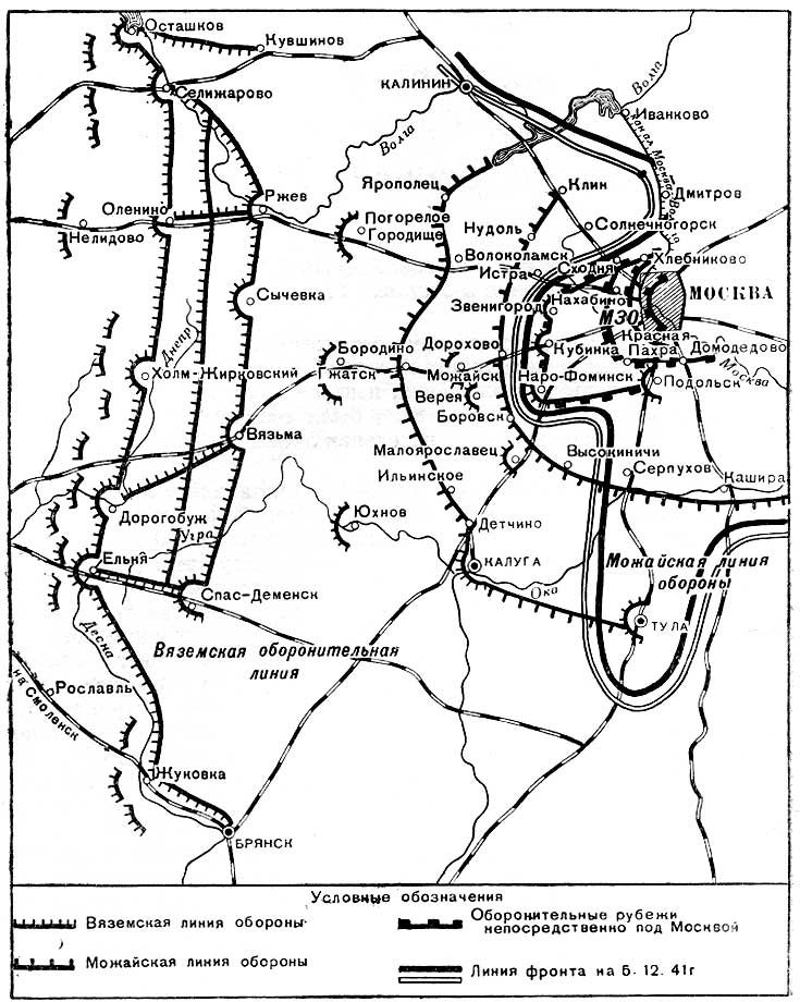 Линии обороны Москвы в ноябре-декабре 1941 года - карта. Вяземская линия обороны, Можайская линия обороны, Оборонительные рубежи непосредственно под Москвой. Линия фронта на 6 декабря 1941 года. Битва за Москву.